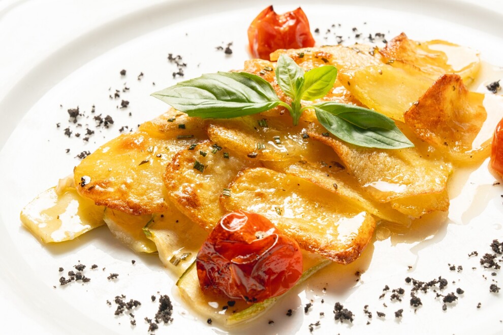 Филе дорадо запеченное с кабачками, вином и травами под слайсами картофеля с помидорами черри и крошкой из маслин