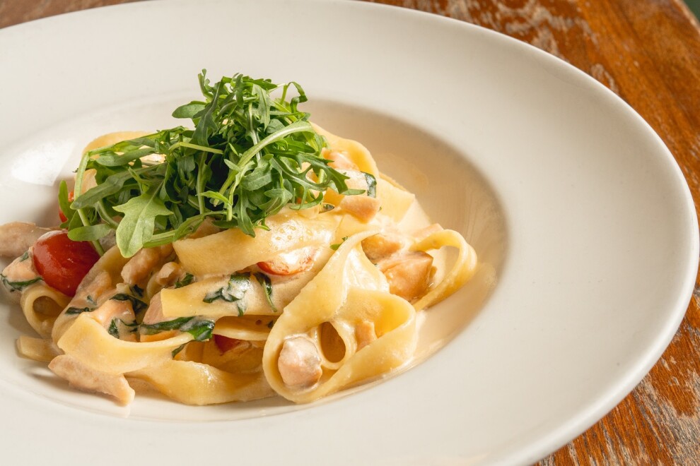 Домашняя паста с чесноком, помидорами черри, кусочками семги, сливками, и листьями рукколы